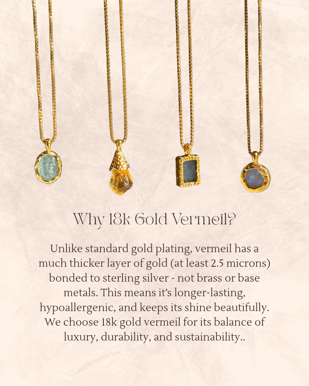 Unlike standard gold plating, Vermeil features a thick layer of 18k gold over sterling silver, making it more durable, luxurious, and long-lasting. It’s a beautiful balance of quality and value — but it’s still delicate, so extra care helps preserve its shine.